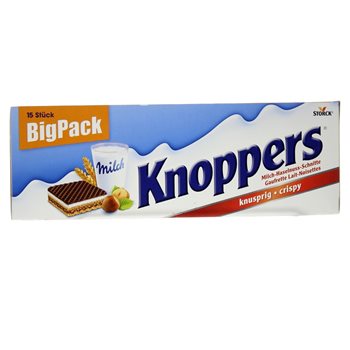 A large pack of Knoppers with 15 pcs. of the crispy snack. The slices weigh 25 g each and are practical to take on the go or as a delicious surprise in a packed lunch. The layered snacks consist of waffle with milk cream and hazelnut nougat cream.