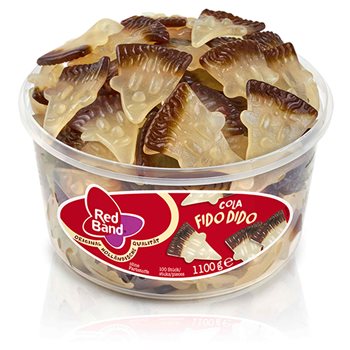 Cabezas de chicle de vino celestial de Red Band. ¿Te gusta el chicle de vino con sabor a cola? Entonces Fido Dido Cola es la elección correcta. El cubo contiene las divertidas cabezas de Fido Dido con el conocido sabor de cola, y la lata está encima de que la friolera de 1150 gramos, que corresponden a más de 100 piezas.